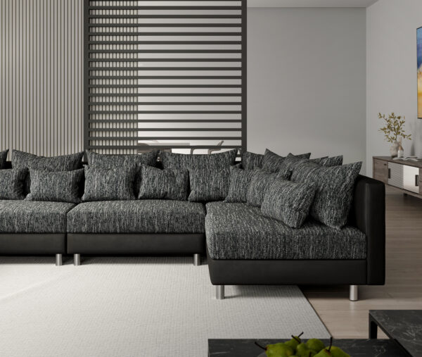 A háttámasz kényelméért 12 nagy párna áll rendelkezésre, melyek azonos színvilágot követnek. Ezen felül a kanapé számos díszpárnával rendelkezik, amelyekkel az ülőgarnitúra kényelmét az egyéni igények szerint személyre szabhatja. A Clovis kárpitozott bútorral egy különleges, moduláris kialakítású bútordarabot vásárol, amely masszív kárpitanyagainak köszönhetően hosszú távon gazdagítja nappaliját.
