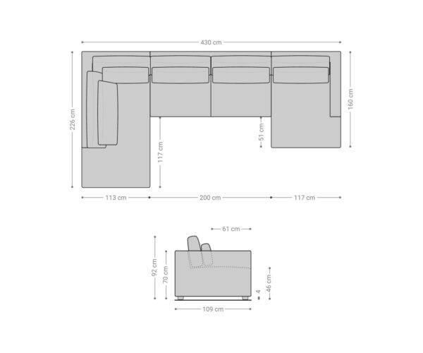 • Bal oldali hosszú fotel mérete kb.: Sz113 x Mé226 x Ma92 cm