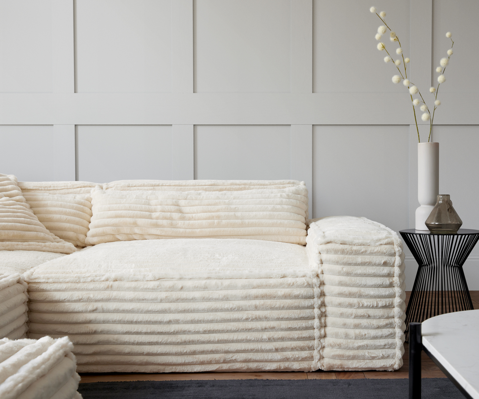A gyönyörű kanapét egy rendkívül puha és testhez simuló plüss kordbársony huzattal látták el, amely a maximális kényelmet nyújtja. A különleges huzat lágy bézs árnyalatban ragyog, amely egyedi és hívogató hangulatot kölcsönöz a nappalidnak.