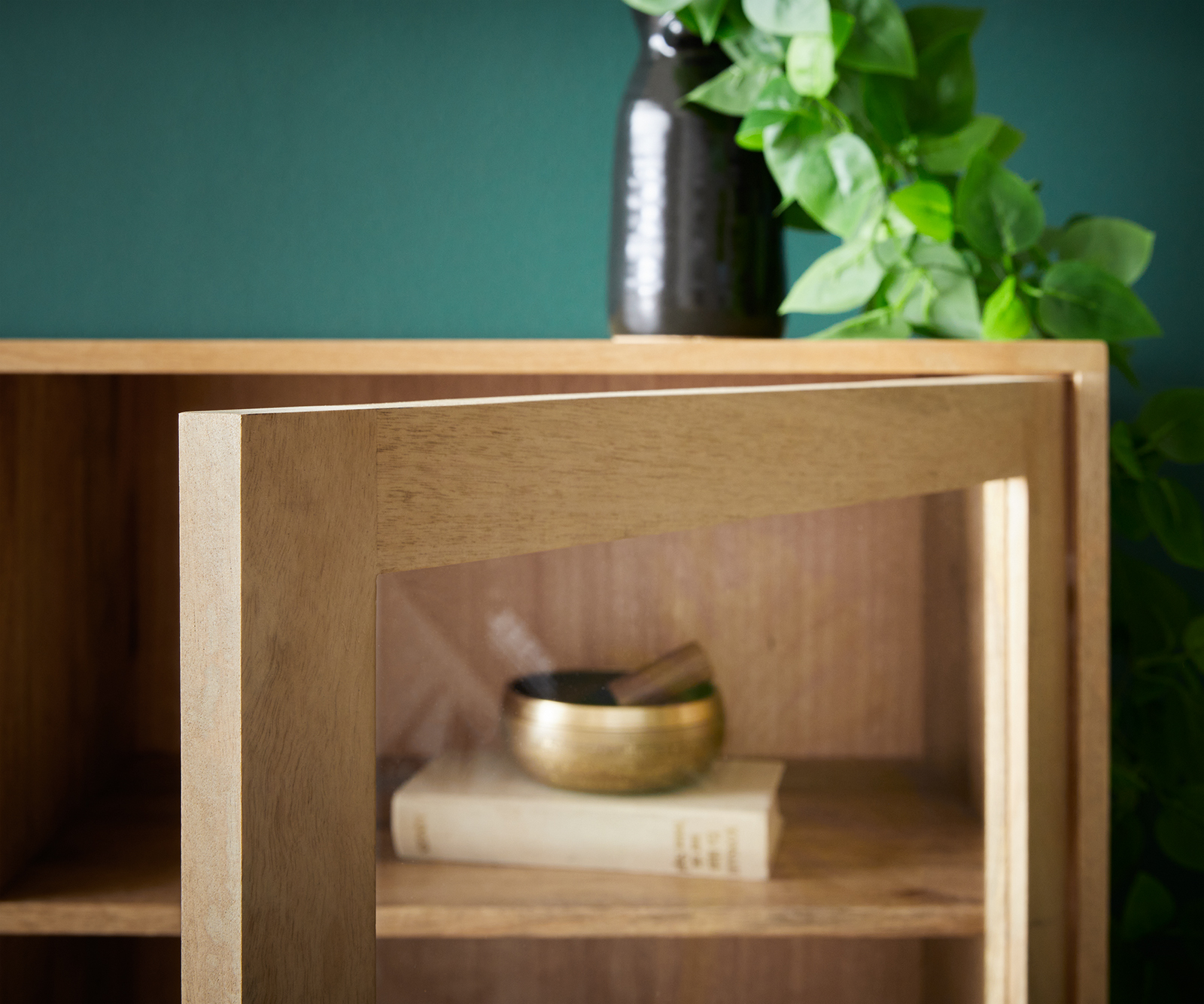 Keskeny vitrinszekrény rend és bemutatás céljára. Az alsó ajtó izgalmas etno mintázata különlegessé teszi a bútort. A vitrinszekrény természetes világos középbarna mangófa színben, enyhe szürkés-sárgás árnyalatokkal ragyog.